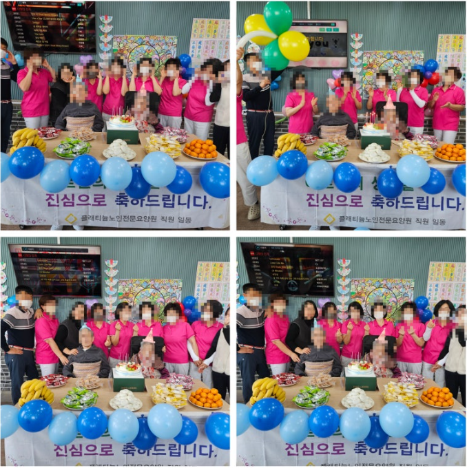 ♥ 2026년 2월 생신잔치 관리자 2026-02-06 13:39 🍰 2026년 2월 어르신 생신잔치플래티늄 유성 요양원에서 2월 생신을맞이하신 어르신들을 위한 따뜻한 생신잔치를 진행했습니다.직원들과 어르신들이 함께모여 노래도 부르고, 축하인사도 나누며 웃음꽃을 피웠습니다.정성껏 준비한 케이크와 간식, 과일을나누며 한 분 한 분의 소중한 생신을진심으로 축하드렸습니다.어르신들의 환한 미소와 "고맙다"는따뜻한 말씀 덕분에 직원들도 더욱행복한 시간이었습니다.앞으로도 플래티늄 유성 요양원은어르신들의 하루하루가 즐겁고 의미있게 채워질 수 있도록 정성을다하겠습니다.2월 생신을 맞이하신 어르신들,다시 한 번 진심으로 축하드립니다.건강하고 행복한 날들 보내세요. 다음글 ♥ 인지미술활동- 입춘 색칠하기 이전글 ♥ 2026년 2월 직원회의 목록