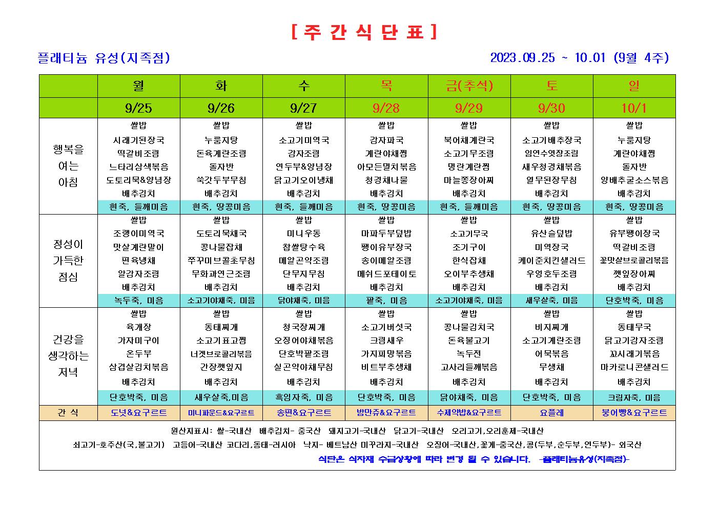 ♡ 2023년 9월 식단표(9월1주~4주) 관리자 2025-04-15 14:16 ♡ 2023년 9월 1주 ~ 9월4주 식단안내 다음글 ♡ 2023년 10월 식단표 (10월 1주 ~ 3주) 이전글 ♡ 2023년 12월 가정통신문 목록
