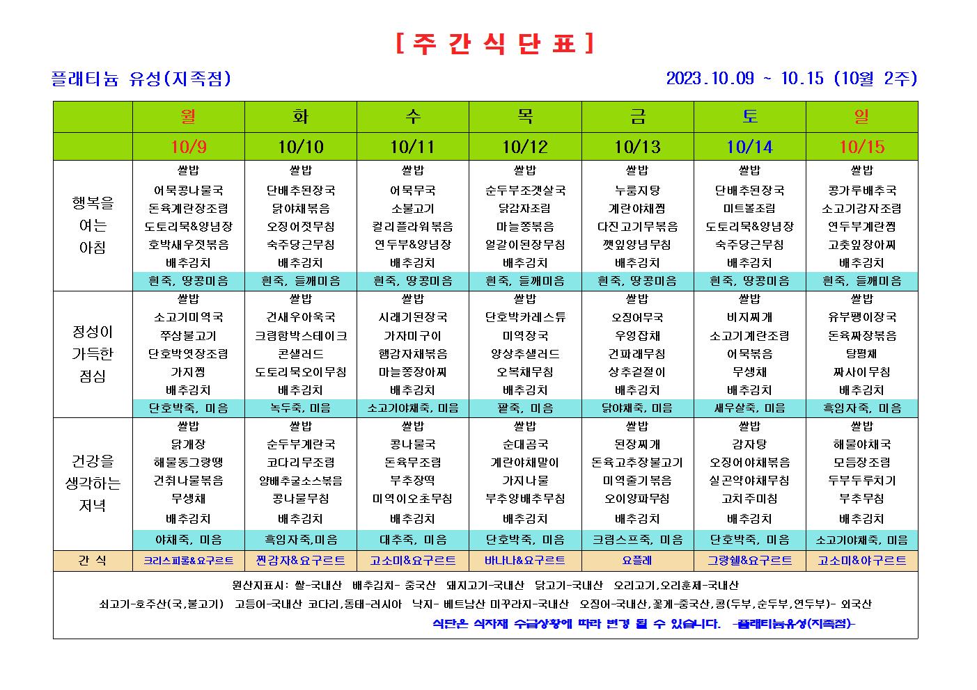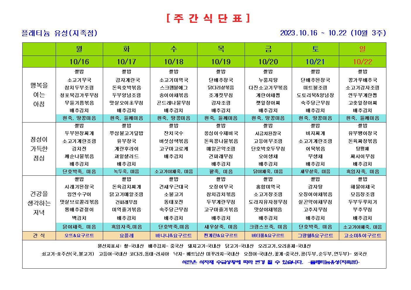 ♡ 2023년 10월 식단표 (10월 1주 ~ 3주) 관리자 2025-04-15 14:22 ♡ 2023년 10월 식단표 (10월 1주 ~ 3주) 다음글 ♡ 2023년 10월 식단표 (10월 4주 ~ 5주) 이전글 ♡ 2023년 9월 식단표(9월1주~4주) 목록