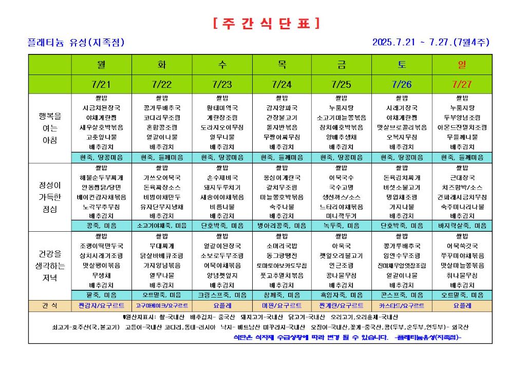 ♡ 2025년 7월 4주 식단안내(7월21일~7월27일) 관리자 2025-07-18 08:24 ♡ 2025년 7월 4주 식단안내(7월21일~7월27일) 다음글 ♡ 2025년 7월 5주 식단안내(7월28일~8월3일) 이전글 ♡ 2025년 7월 3주 식단안내(7월14일~7월20일) 목록