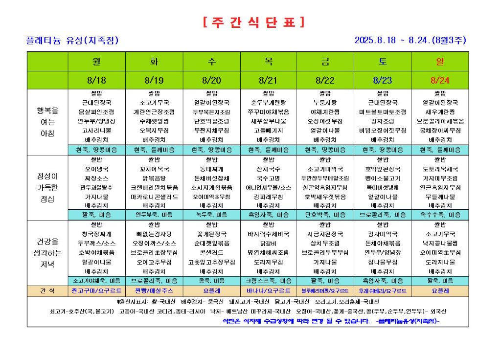 ♡ 2025년 8월 3주 식단안내(8월18일~8월24일) 관리자 2025-08-13 08:01 ♡ 2025년 8월 3주 식단안내(8월18일~8월24일) 다음글 ♡ 2025년 8월 4주 식단안내(8월25일~8월31일) 이전글 ♡ 2025년 8월 2주 식단안내(8월11일~8월17일) 목록