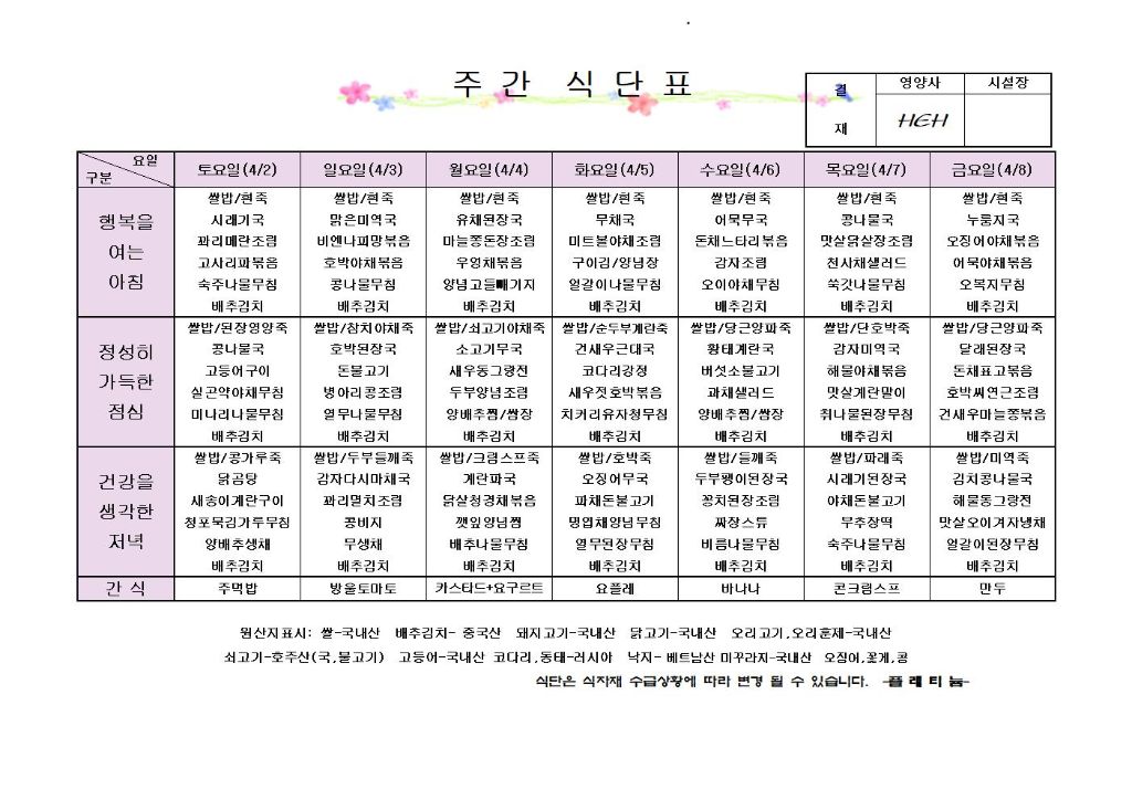 ♡ 2022년 4월 1주 식단안내(4월2일~4월8일) 최고관리자 2022-04-01 17:28 다음글 ♡ 2022년 4월 2주 식단안내(4월9일~4월15일) 이전글 ♡ 2022년 3월 5주 식단안내(3월26일~4월1일) 목록