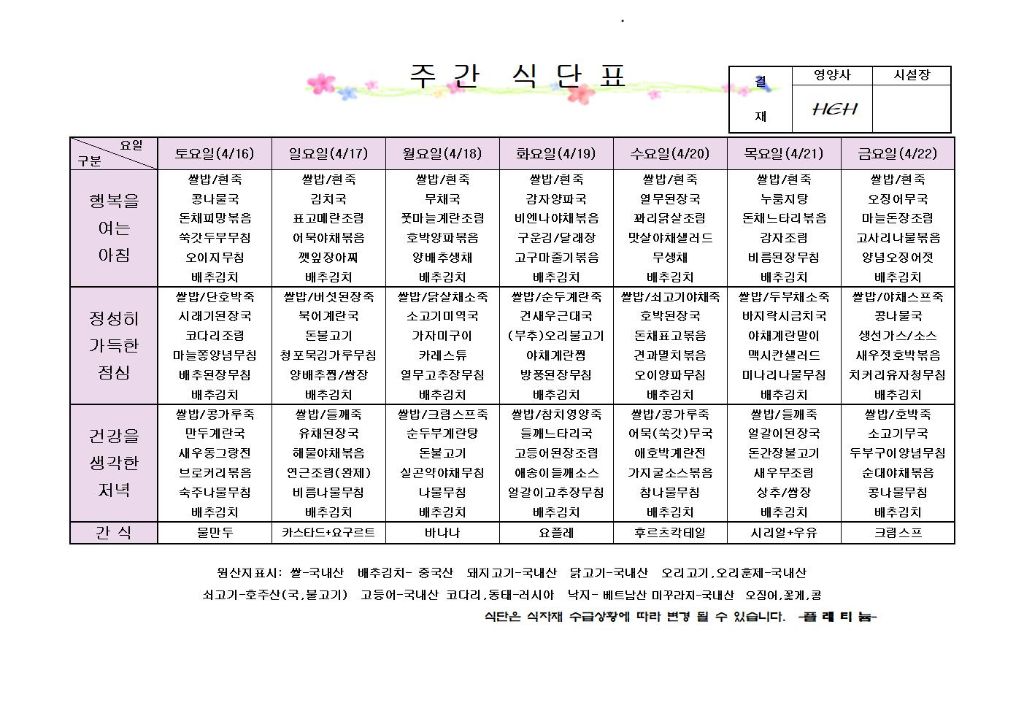 ♡ 2022년 4월 3주 식단안내(4월16일~4월22일) 최고관리자 2022-04-15 16:54 다음글 ♡ 2022년 4월 4주 식단안내(4월23일~4월29일) 이전글 ♡ 2022년 4월 2주 식단안내(4월9일~4월15일) 목록