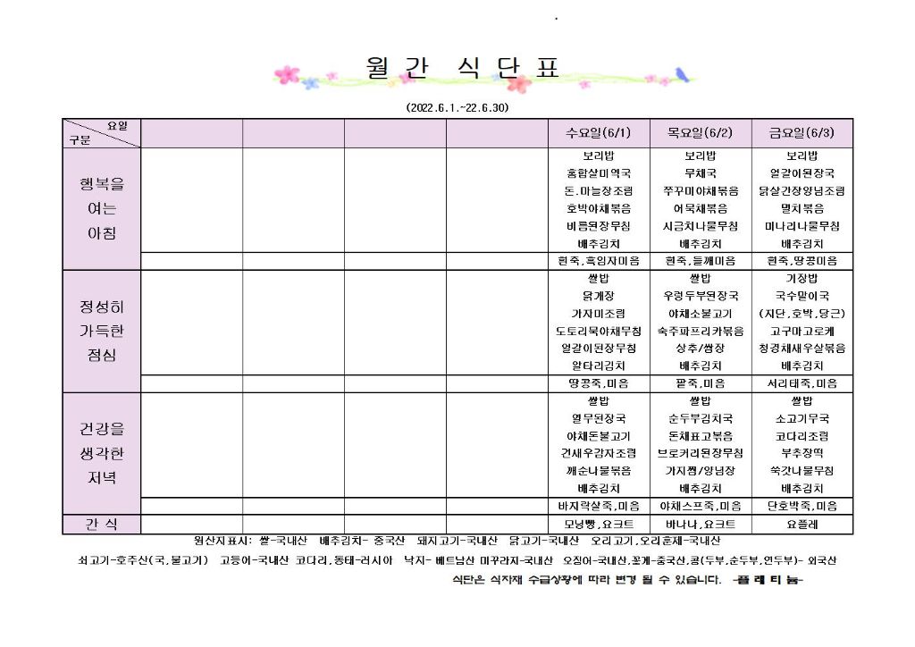 ♡ 2022년 6월 1주 식단안내(6월1일~6월3일) 최고관리자 2022-05-31 16:52 다음글 ♡ 2022년 6월 2주 식단안내(6월4일~6월10일) 이전글 ♡ 2022년 5월 5주 식단안내(5월28일~5월31일) 목록