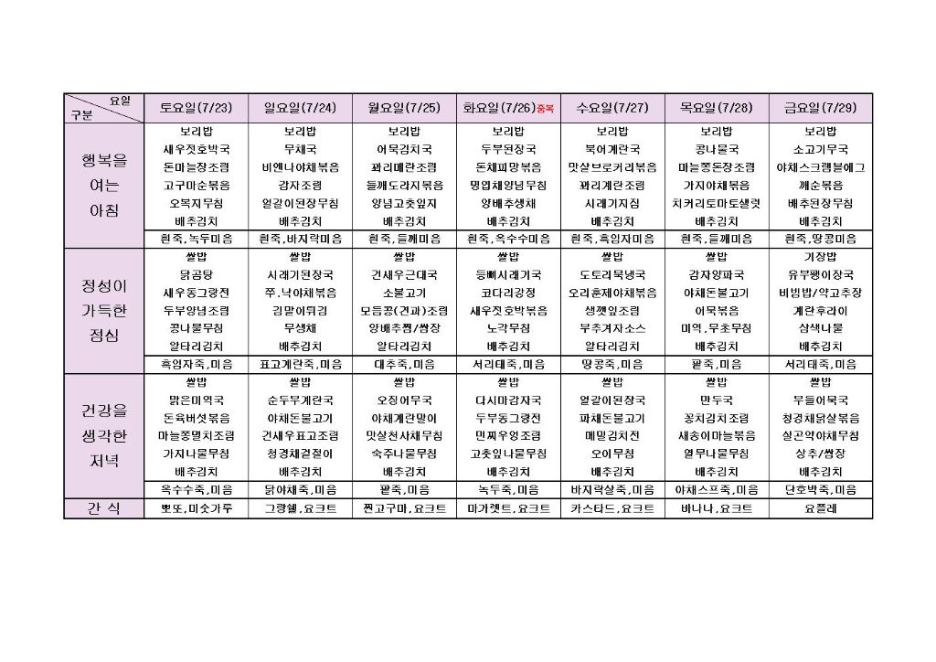 ♡ 2022년 7월 4주 식단안내(7월23일~7월29일) 최고관리자 2022-07-22 14:52 다음글 ♡ 2022년 7월 5주 식단안내(7월30일~7월31일) 이전글 ♡ 2022년 7월 3주 식단안내(7월16일~7월22일) 목록