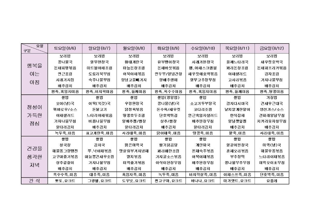 ♡ 2022년 8월 2주 식단안내(8월6일~8월12일) 최고관리자 2022-08-05 11:08 다음글 ♡ 2022년 8월 3주 식단안내(8월13일~8월19일) 이전글 ♡ 2022년 8월 1주 식단안내(8월1일~8월5일) 목록
