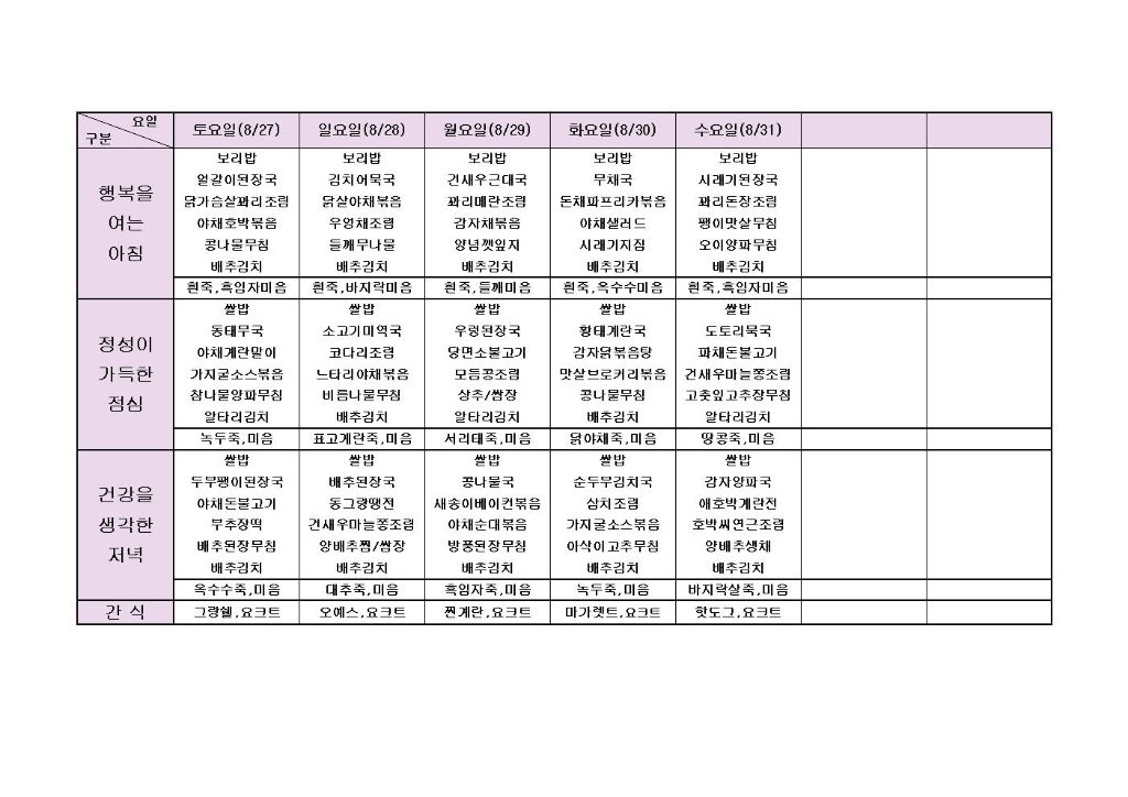 ♡ 2022년 8월 5주 식단안내(8월27일~8월31일) 최고관리자 2022-08-26 14:36 다음글 ♡ 2022년 9월 1주 식단안내(9월1일~9월2일) 이전글 ♡ 2022년 8월 4주 식단안내(8월20일~8월26일) 목록