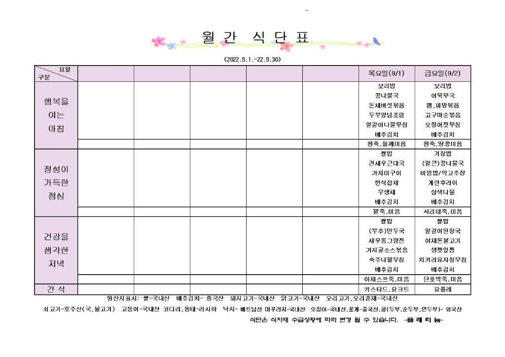 ♡ 2022년 9월 1주 식단안내(9월1일~9월2일) 최고관리자 2022-08-31 17:51 다음글 ♡ 2022년 9월 2주 식단안내(9월3일~9월9일) 이전글 ♡ 2022년 8월 5주 식단안내(8월27일~8월31일) 목록