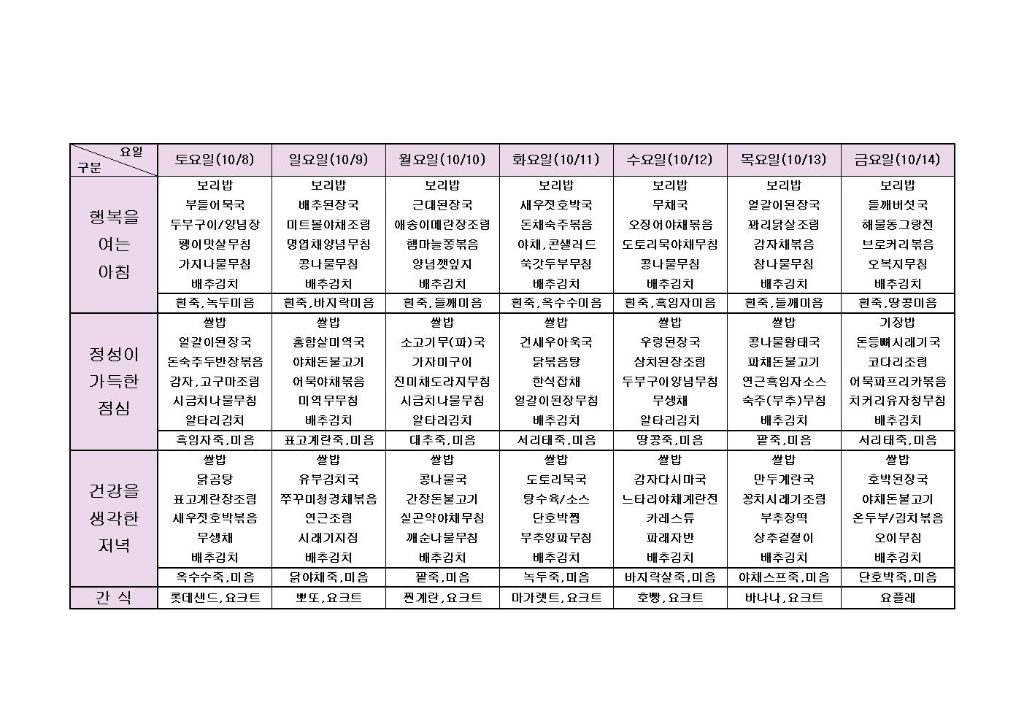 ♡ 2022년 10월 2주 식단안내(10월8일~10월14일) 최고관리자 2022-10-07 13:49 다음글 ♡ 2022년 10월 3주 식단안내(10월15일~10월21일) 이전글 ♡ 2022년 10월 1주 식단안내(10월1일~10월7일) 목록