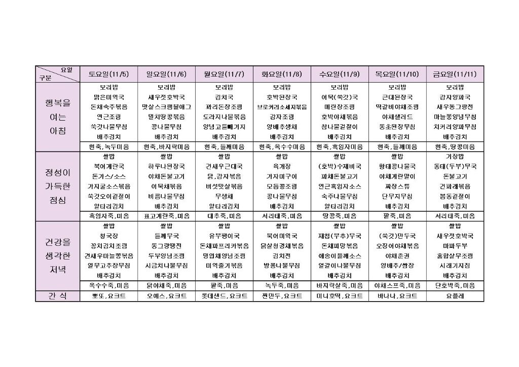 ♡ 2022년 11월 2주 식단안내(11월5일~11월11일) 최고관리자 2022-11-04 16:23 다음글 ♡ 2022년 11월 3주 식단안내(11월12일~11월18일) 이전글 ♡ 2022년 11월 1주 식단안내(11월1일~11월4일) 목록
