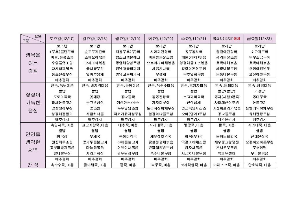 ♡ 2022년 12월 4주 식단안내(12월17일~12월23일) 최고관리자 2022-12-16 10:29 다음글 ♡ 2022년 12월 5주 식단안내(12월24일~12월30일) 이전글 ♡ 2022년 12월 3주 식단안내(12월10일~12월16일) 목록