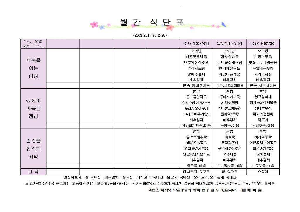 ♡ 2023년 2월 1주 식단안내(2월1일~2월3일) 최고관리자 2023-02-01 09:12 다음글 ♡ 2023년 2월 2주 식단안내(2월4일~2월10일) 이전글 ♡ 2023년 1월 5주 식단안내(1월28일~1월31일) 목록