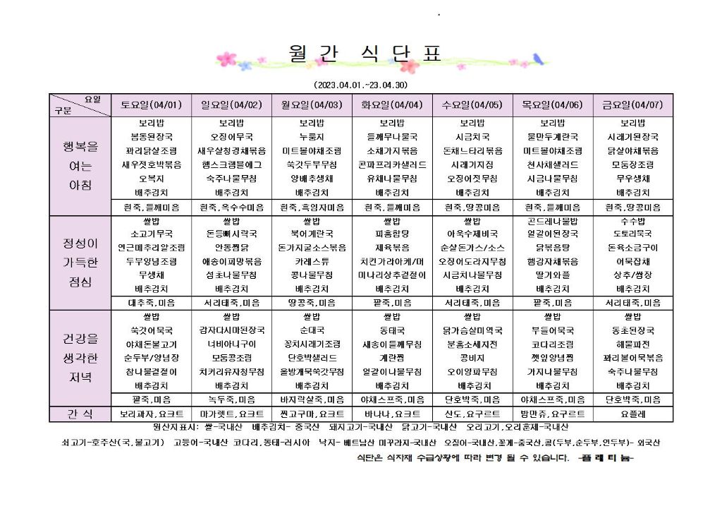 ♡ 2023년 4월 1주 식단안내(4월1일~4월7일) 최고관리자 2023-04-01 08:46 다음글 ♡ 2023년 4월 2주 식단안내(4월8일~4월14일) 이전글 ♡ 2023년 3월 5주 식단안내(3월25일~3월31일) 목록