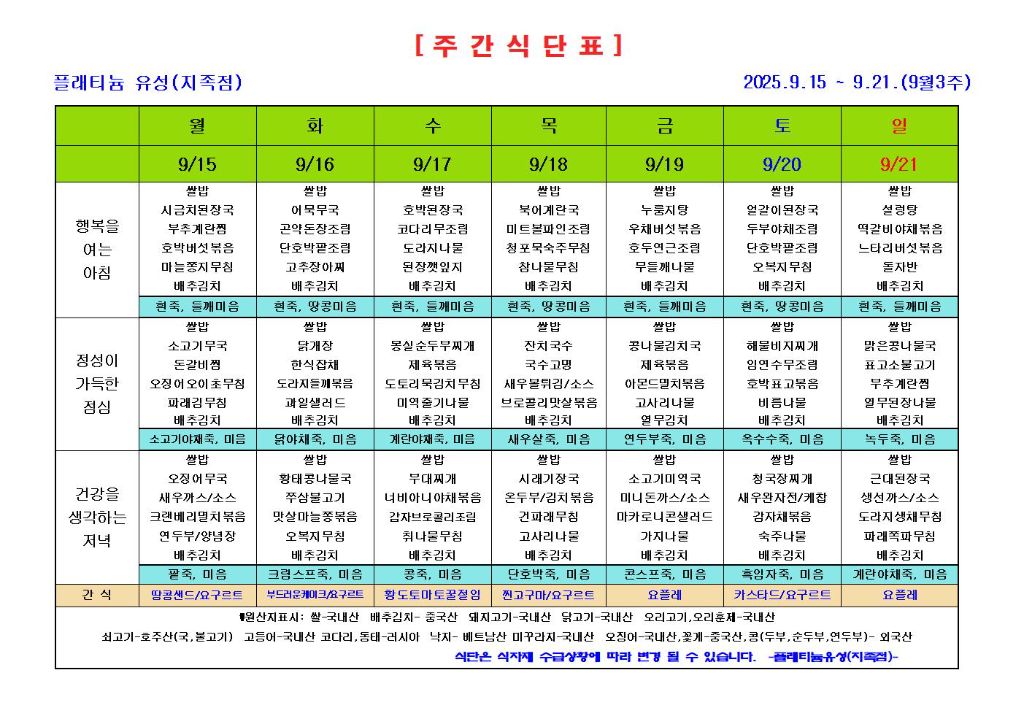 ♡ 2025년 9월 3주 식단안내(9월15일~9월21일) 관리자 2025-09-10 09:38 ♡ 2025년 9월 3주 식단안내(9월15일~9월21일) 다음글 ♡ 2025년 9월 4주 식단안내(9월22일~9월28일) 이전글 ♡ 2025년 9월 2주 식단안내(9월8일~9월14일) 목록