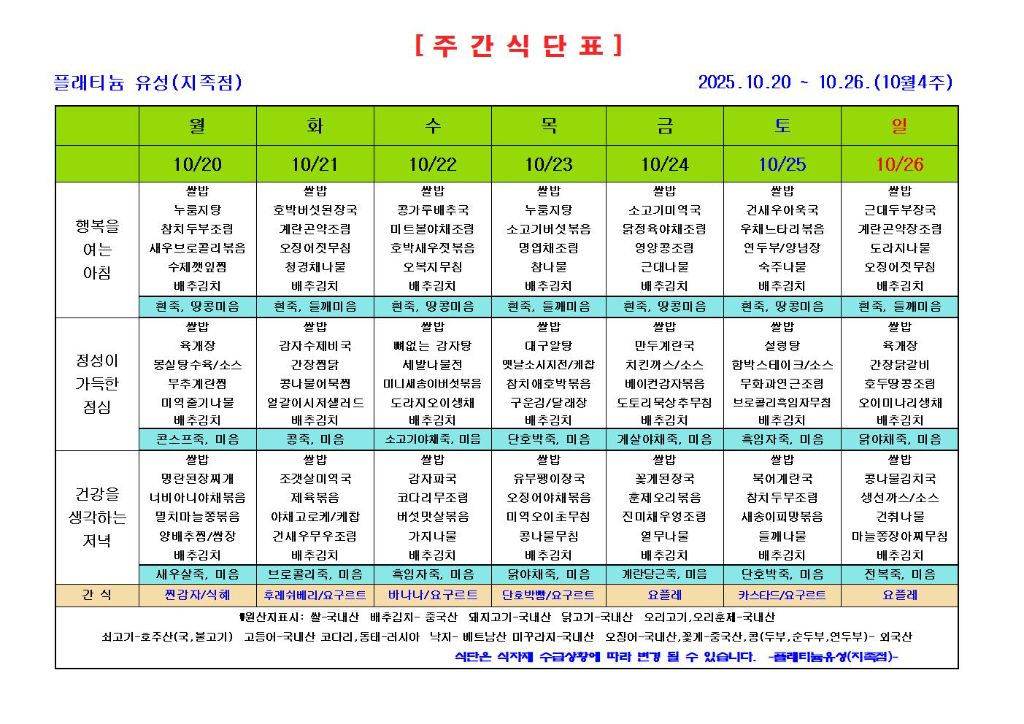 ♡ 2025년 10월 4주 식단안내(10월20일~10월26일) 관리자 2025-10-15 14:31 ♡ 2025년 10월 4주 식단안내(10월20일~10월26일) 다음글 ♡ 2025년 지역사회 행사참여 안내 이전글 ♡ 2025년 입소어르신 독감*코로나 예방 접종 안내 목록