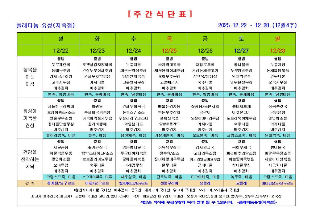 ♡ 2025년 12월 4주 식단안내(12월22일~12월28일) 관리자 2025-12-17 09:48 ♡ 2025년 12월 4주 식단안내(12월22일~12월28일) 다음글 ♡ 2025년 하반기 재난상황훈련(지진-12.18) 이전글 ♡ 2025년 12월 3주 식단안내(12월15일~12월21일) 목록