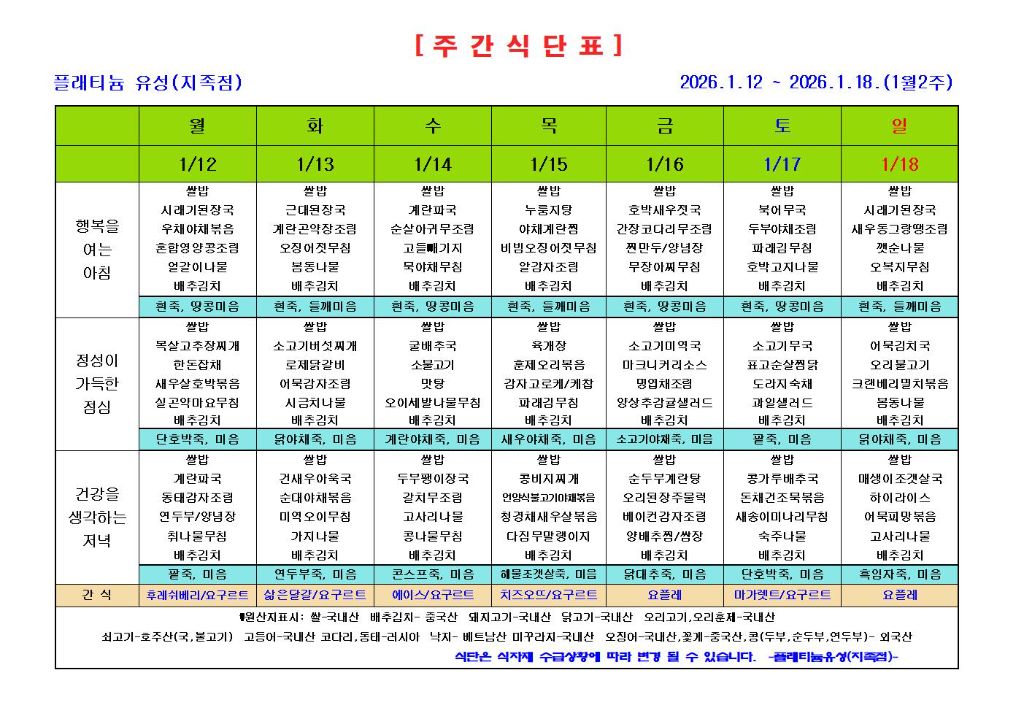 ♡ 2026년 1월 2주 식단안내(1월12일~1월18일) 관리자 2026-01-06 15:45 ♡ 2026년 1월 2주 식단안내(1월12일~1월18일) 다음글 ♡ 2026년 1월 3주 식단안내(1월19일~1월25일) 이전글 ♡ 2026년 (1)월 직원회의 목록