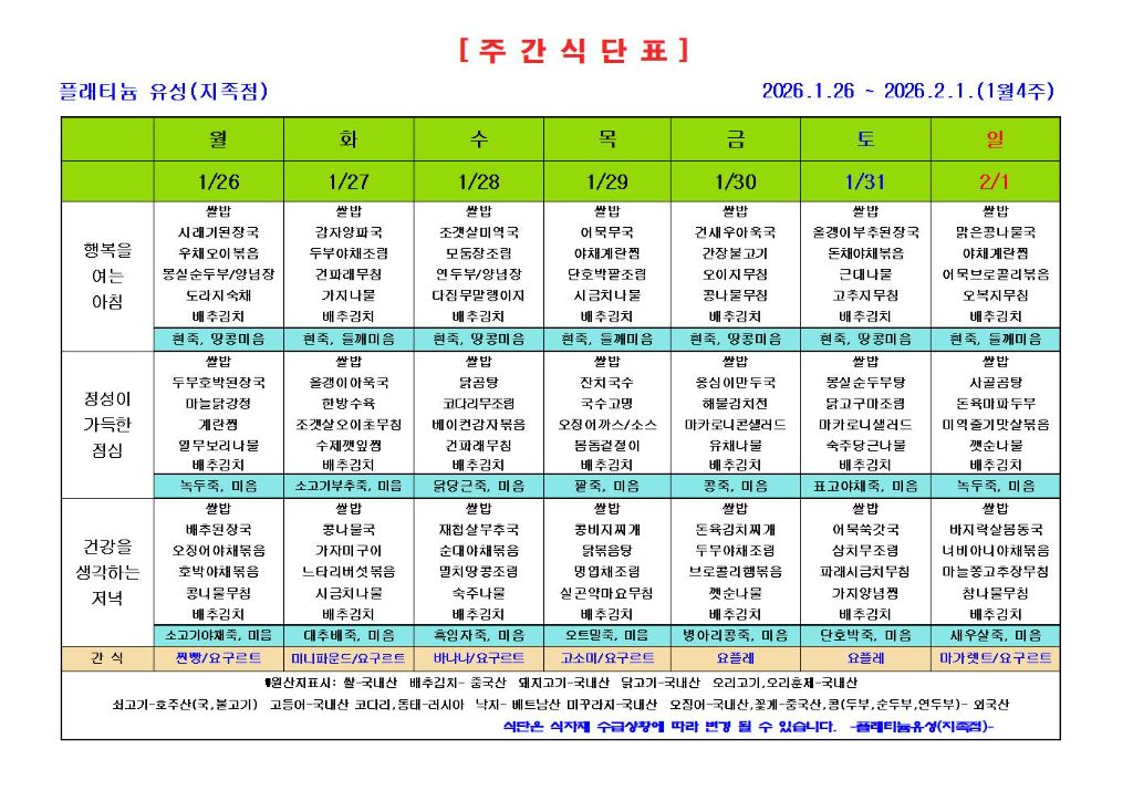 ♡ 2026년 1월 4주 식단안내(1월26일~2월1일) 관리자 2026-01-26 11:07 ♡ 2026년 1월 4주 식단안내(1월26일~2월1일) 다음글 ♡ 2026년 1월 가정통신문 이전글 ♡ 2026년 1월 3주 식단안내(1월19일~1월25일) 목록