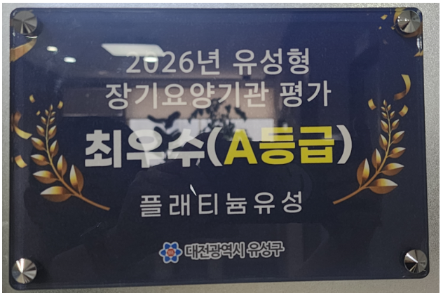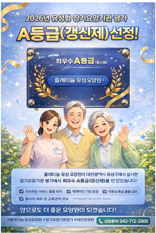 ♡ 2026년 유성형 장기요양기관 평가 A등급(갱신제) 관리자 2026-03-04 14:25 안녕하세요.플래티늄 유성 요양원입니다.대전 유성구가 어르신 돌봄 수준 향상을 위해'2026년 유성형 장기요양기관 등급제'를운영하였습니다.기관 운영 실적을 객관적으로 평가해A-B-C 3단계로 구분하였으며,이 중 A등급 58곳, B등급 14곳, C등급 2곳으로등급제가 구분되었습니다.이중 A등급은 최우수시설로 분류하고있으며저희 플래티늄 유성 요양원은최우수 A등급(갱신제)을 받았습니다.이번 평가는 대전광역시 유성구에서실시한 유성형 장기요양기관 평가로,기관 운영의 전문성, 서비스의 질, 어르신만족도, 종사자 관리 등전반적인 운영 수준을 종합적으로심사하는 제도입니다.📌 A등급(갱신제) 의미는?✔️ 지속적인 서비스 품질 유지✔️체계적인 기관 운영✔️ 어르신 중심 돌봄 실천✔️ 종사자 처우 및 교육관리 우수특히 갱신제는 일회성이 아닌, 꾸준한관리와 유지가 이루어져야 받을 수 있는등급으로더욱 의미 있는 결과입니다.💛 플래티늄 유성 요양원의 약속저희는 단순한 돌봄을 넘어어르신 한 분 한 분의 삶의 질을 높이는맞춤형 케어를 실천하고 있습니다.✔️ 개별 맞춤 프로그램 운영✔️ 체계적인 건강관리 시스템✔️ 정기적인 보호자 상담✔️ 전문 인력의 책임 돌봄이번 갱신제 A등급 선정은어르신과 보호자님들의 믿음,그리고 직원들의 헌신이 함께 만들어낸값진 결과입니다.🌿 앞으로도 더 좋은 요양원이되겠습니다.현재에 만족하지 않고더 안전하고, 더 따뜻하고, 더 전문적인요양 서비스를 제공하기 위해끊임없이 노력하겠습니다.어르신이 행복한 공간,보호자가 안심할 수 있는 공간,플래티늄 유성 요양원이 함께하겠습니다. 다음글 ♡ 2026년 3월 2주 식단안내(3월9일~3월15일) 이전글 ♡ 2026년 2월 프로그램 안내 목록
