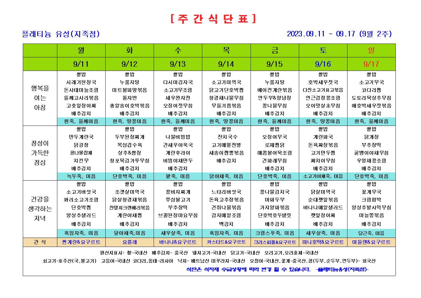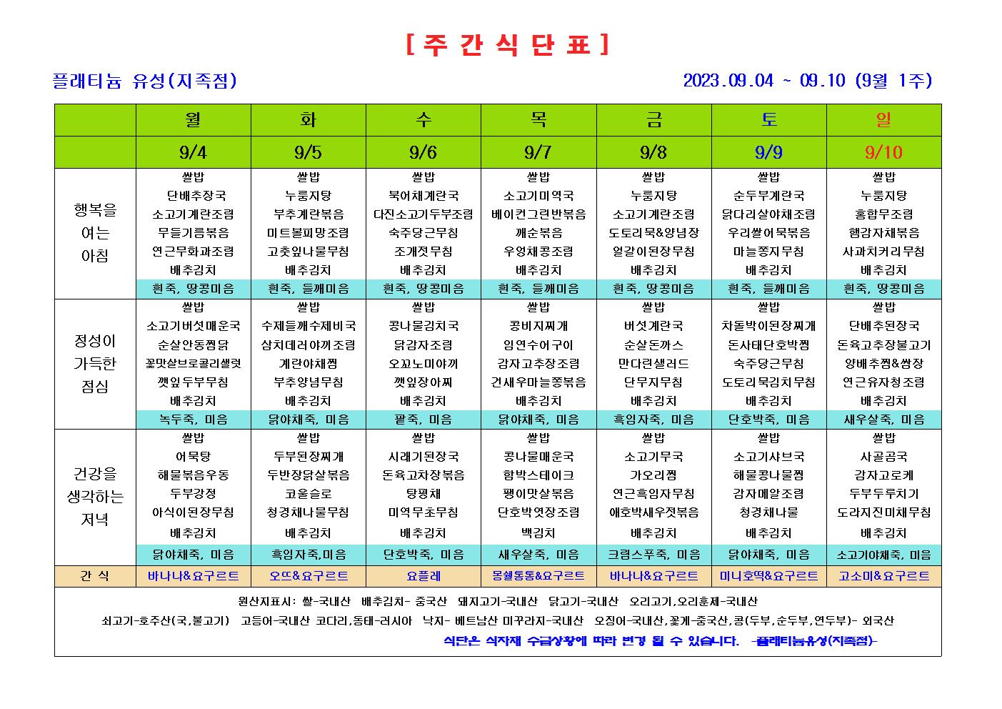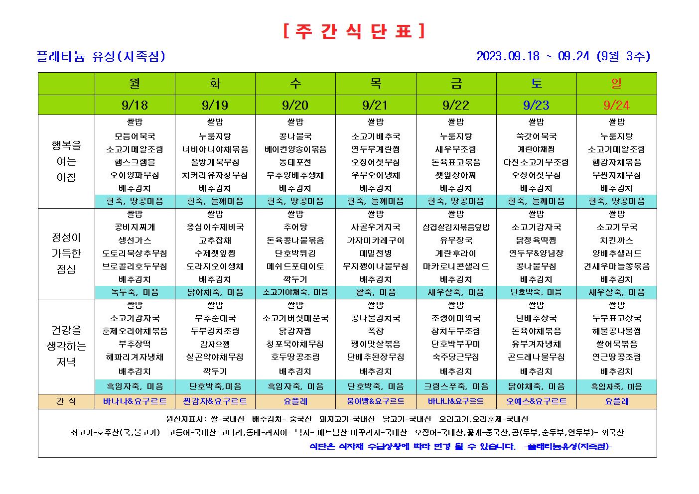 ♡ 2023년 9월 식단표(9월1주~4주) 관리자 2025-04-15 14:16 ♡ 2023년 9월 1주 ~ 9월4주 식단안내 다음글 ♡ 2023년 10월 식단표 (10월 1주 ~ 3주) 이전글 ♡ 2023년 12월 가정통신문 목록
