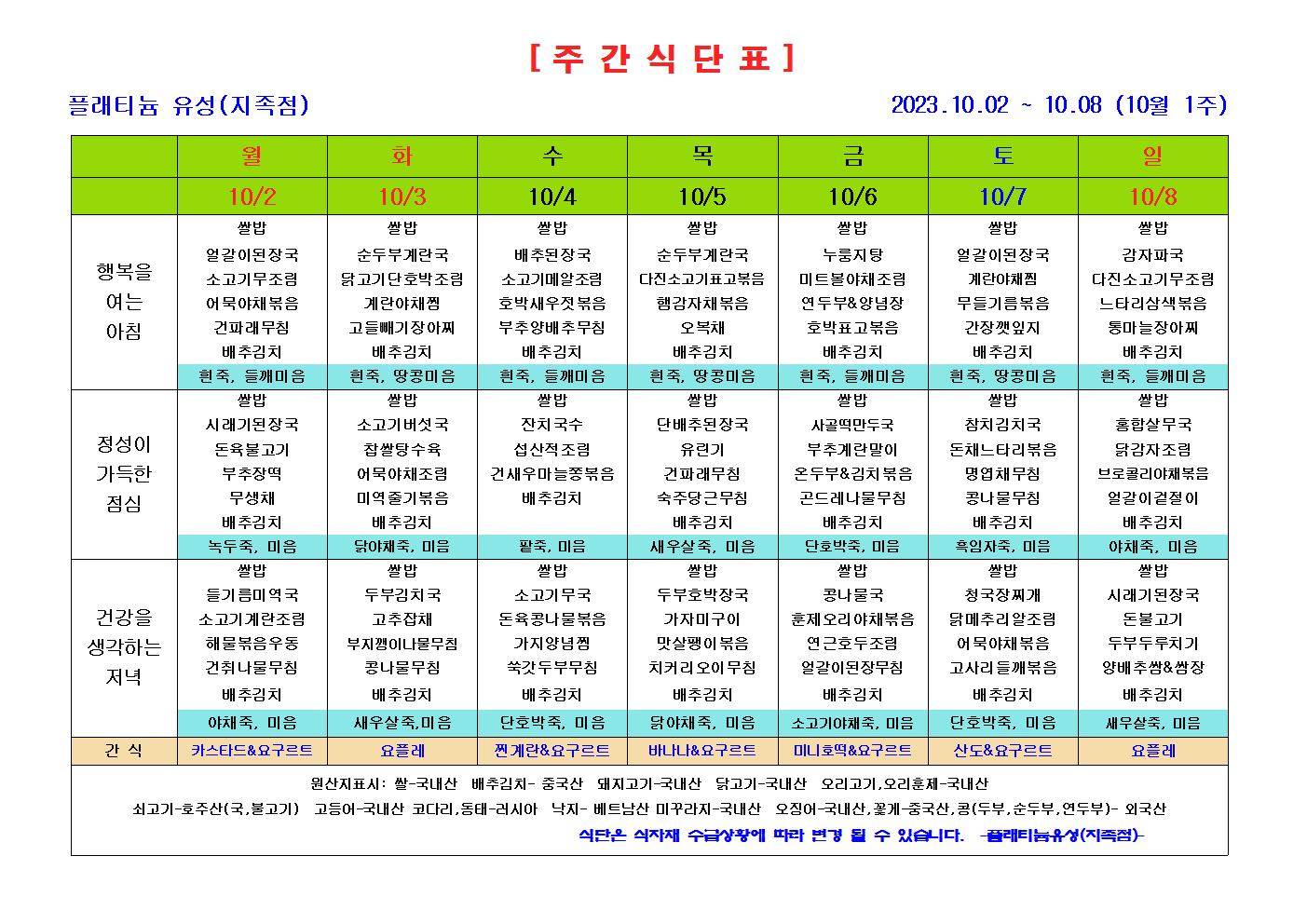 ♡ 2023년 10월 식단표 (10월 1주 ~ 3주) 관리자 2025-04-15 14:22 ♡ 2023년 10월 식단표 (10월 1주 ~ 3주) 다음글 ♡ 2023년 10월 식단표 (10월 4주 ~ 5주) 이전글 ♡ 2023년 9월 식단표(9월1주~4주) 목록