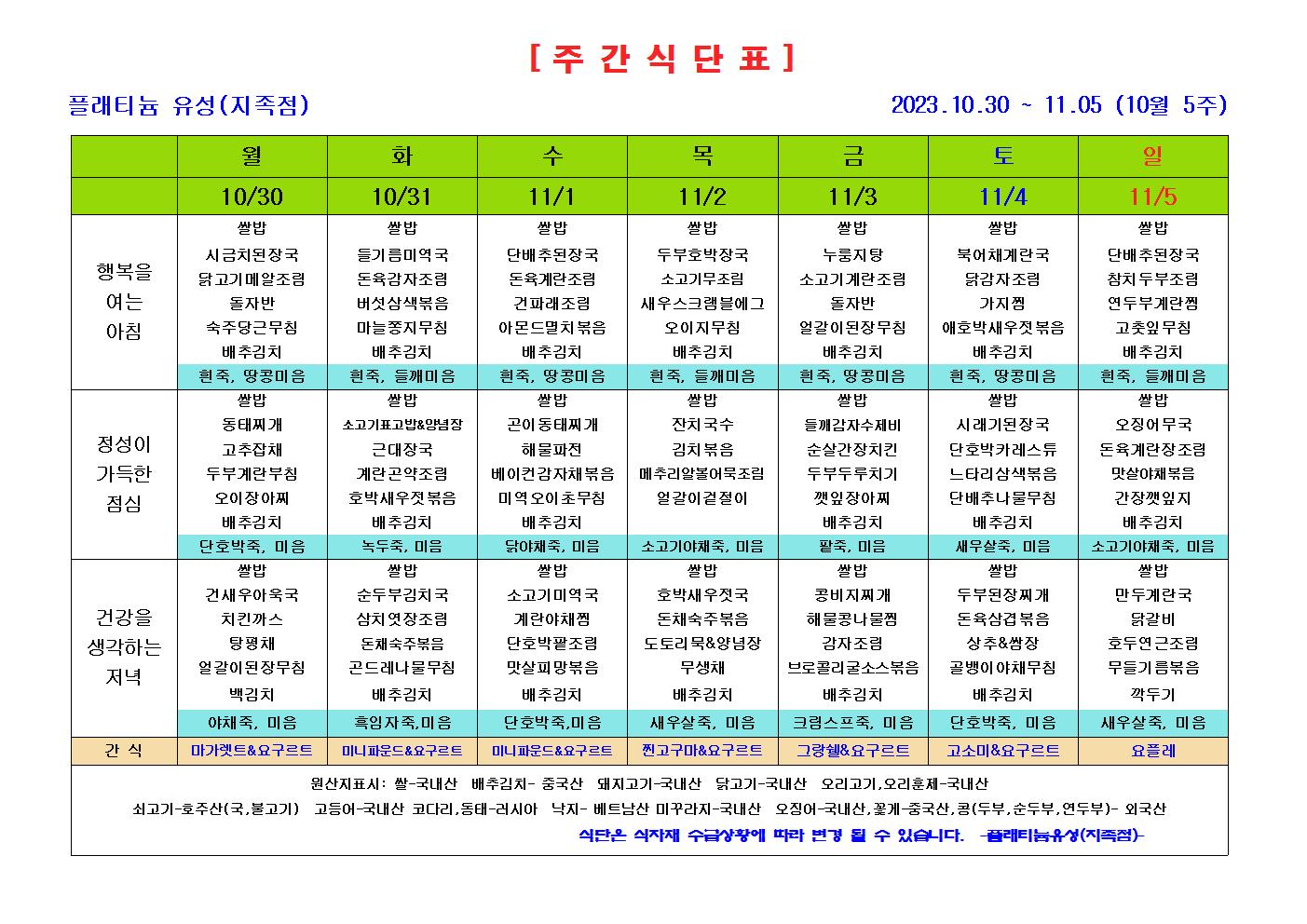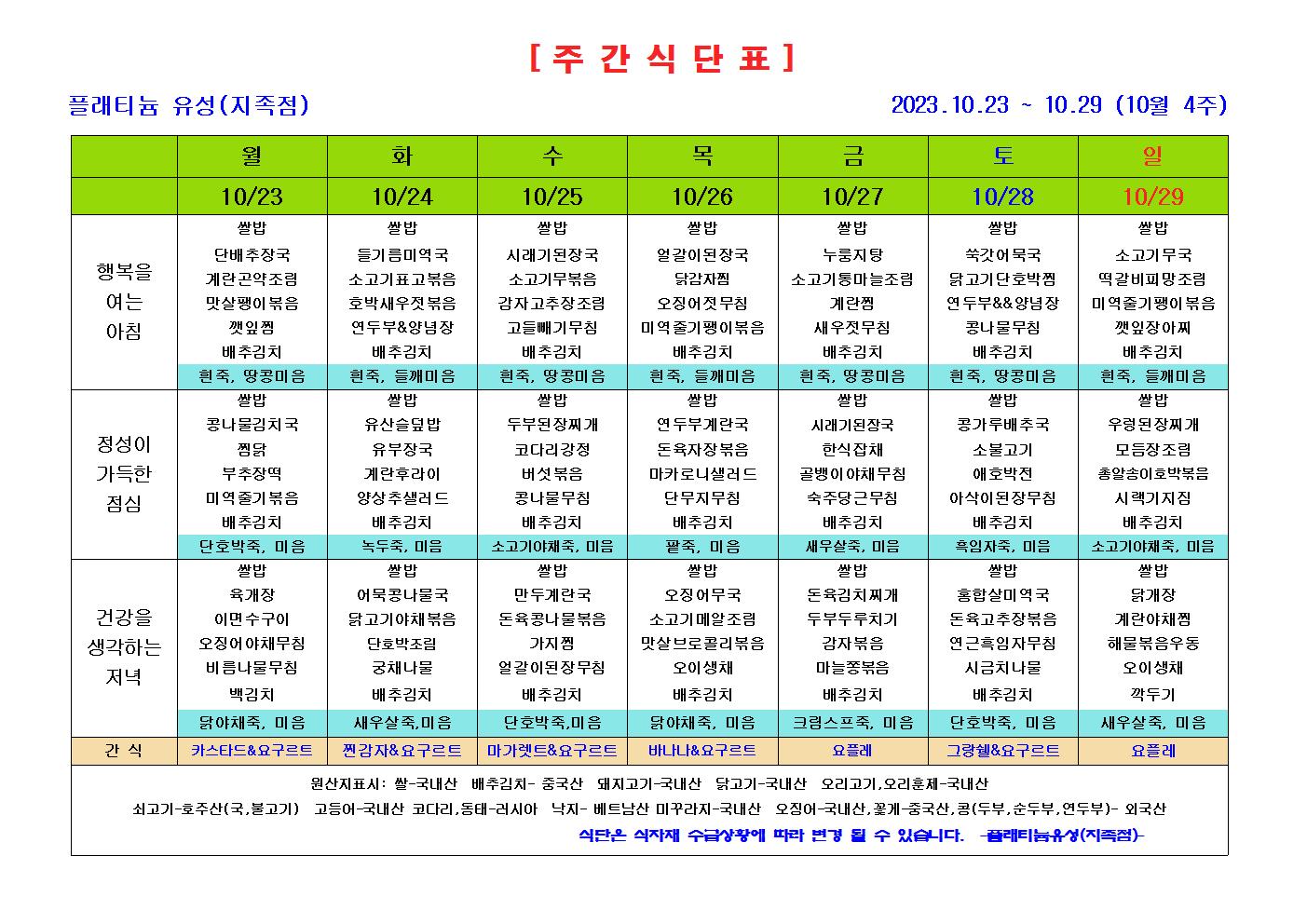 ♡ 2023년 10월 식단표 (10월 4주 ~ 5주) 관리자 2025-04-15 14:24 ♡ 2023년 10월 식단표 (10월 4주 ~ 5주) 다음글 ♡ 2023년 11월 식단표 (11월 1주 ~ 2주) 이전글 ♡ 2023년 10월 식단표 (10월 1주 ~ 3주) 목록
