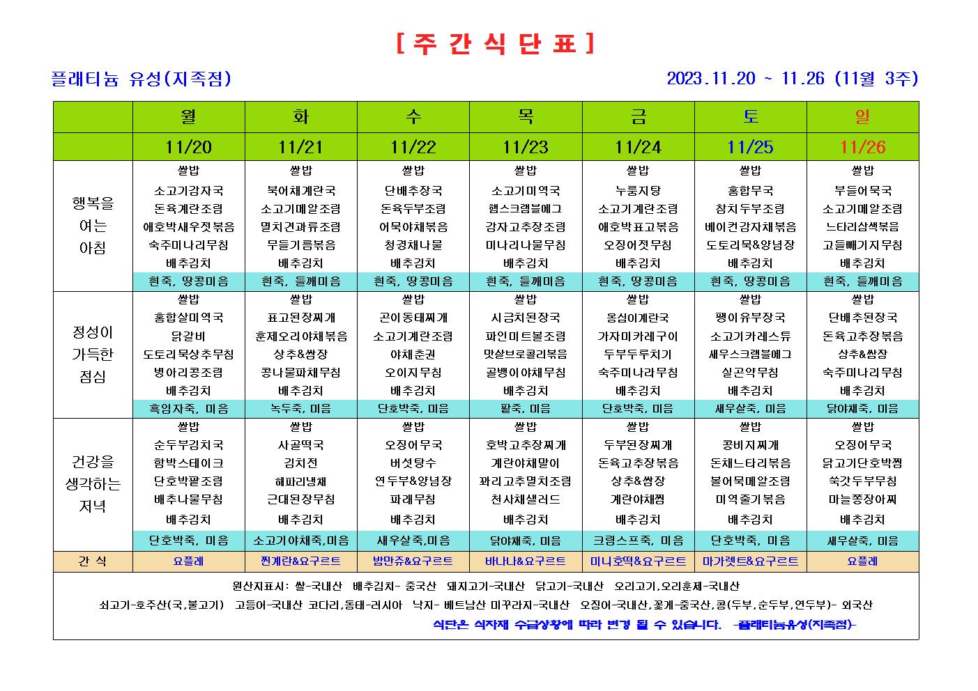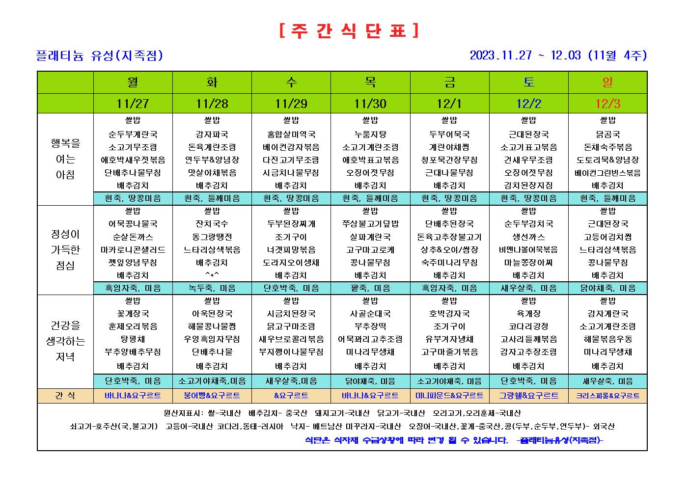 ♡ 2023년 11월 식단표 (11월 3주 ~ 4주) 관리자 2025-04-15 14:29 ♡ 2023년 11월 식단표 (11월 3주 ~ 4주) 다음글 ♡ 2023년 12월 식단표 (12월 1주 ~ 3주) 이전글 ♡ 2023년 11월 식단표 (11월 1주 ~ 2주) 목록