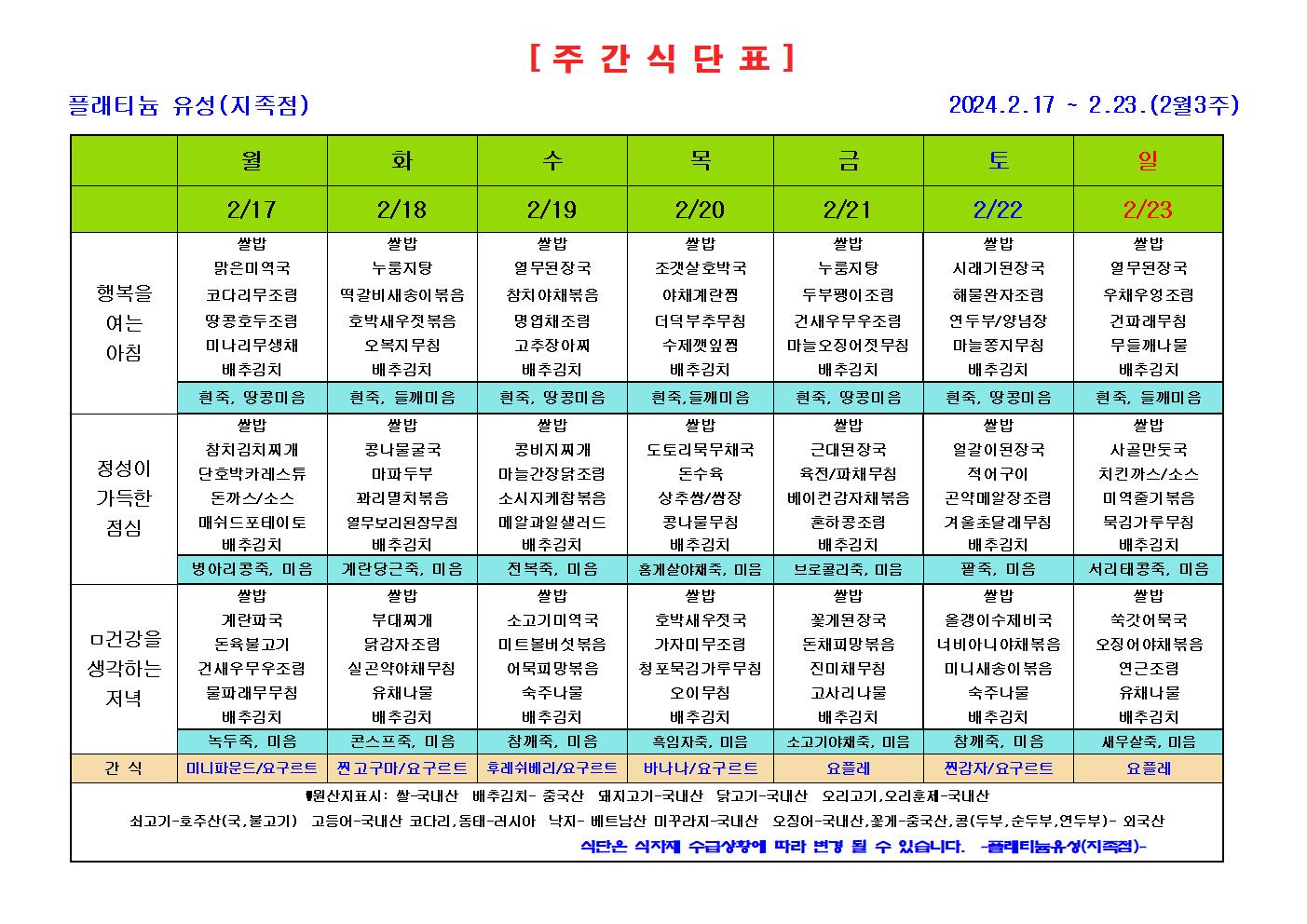 ♡ 2025년 2월 3주 식단안내 ( 2월 17일 ~ 2월 23일) 관리자 2025-04-18 14:09 ♡ 2025년 2월 3주 식단안내 ( 2월 17일 ~ 2월 23일) 다음글 ♡ 2025년 2월 4주 식단안내 ( 2월 24일 ~ 3월 2일) 이전글 ♡ 2025년 2월 2주 식단안내 ( 2월 10일 ~ 2월 16일) 목록