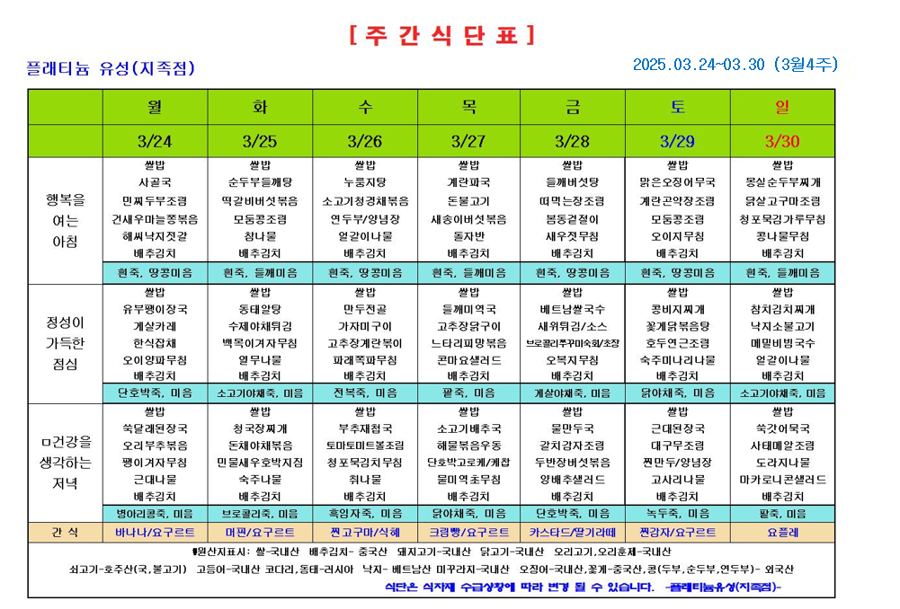 ♡ 2025년 3월 4주 식단안내(3월24일~3월30일) 관리자 2025-04-18 14:25 ♡ 2025년 3월 4주 식단안내(3월24일~3월30일) 다음글 ♡ 2025년 3월 가정통신문 이전글 ♡ 2025년 3월 3주 식단안내(3월17일~3월23일) 목록