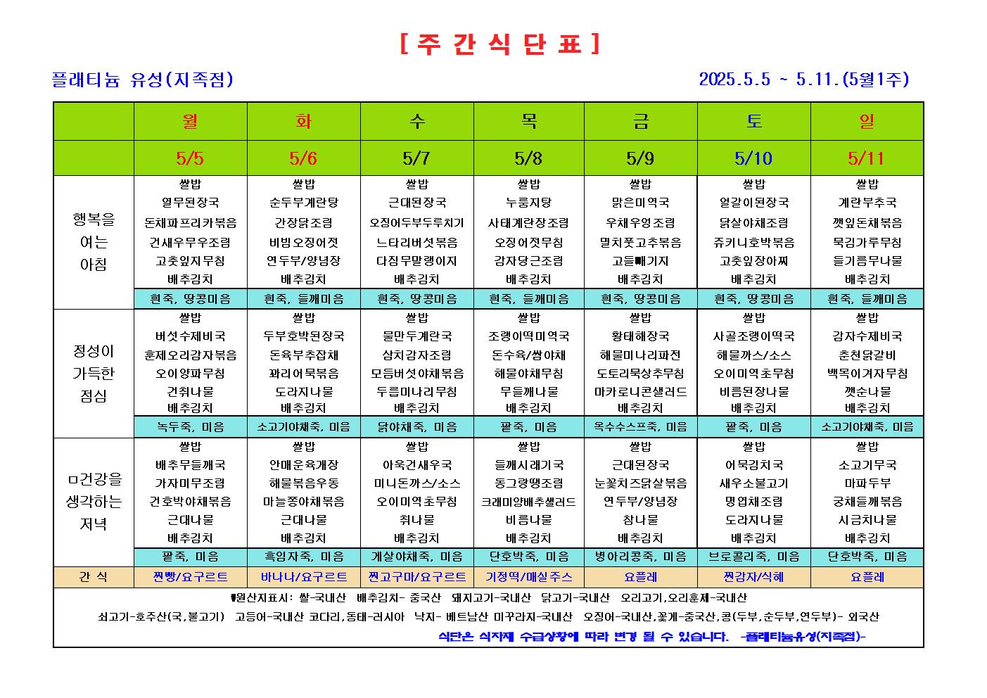♡ 2025년 5월 1주 식단안내(5월5일~5월11일) 관리자 2025-05-02 12:43 ♡ 2025년 5월 1주 식단안내(5월5일~5월11일) 다음글 ♡ 2025년 4월 프로그램 안내 이전글 ♡ 2025년 5월 어버이날 행사 초청안내(보호자) 목록