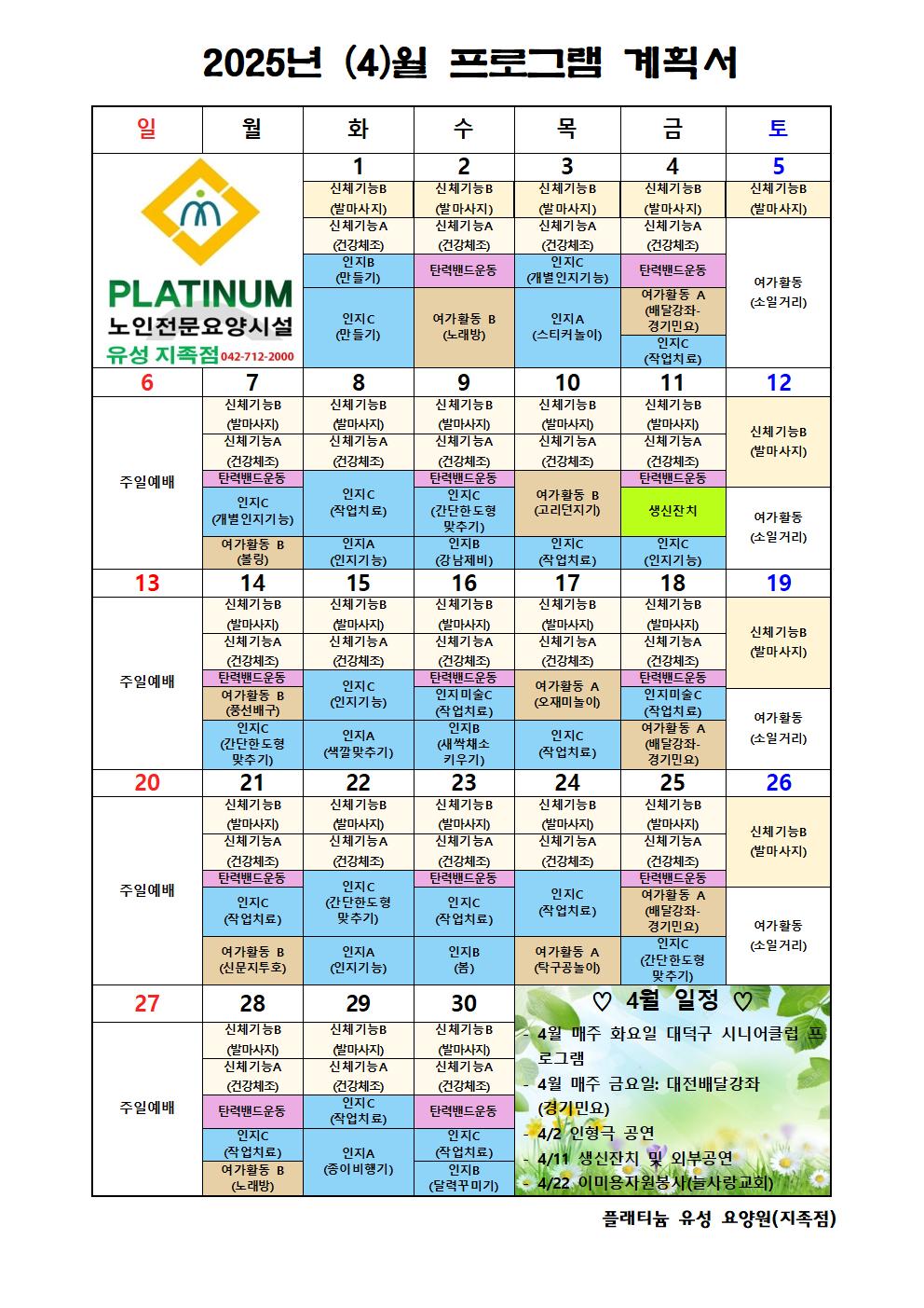 ♡ 2025년 4월 프로그램 안내 관리자 2025-05-02 13:37 ♡ 2025년 4월 프로그램 안내 다음글 ♡ 2025년 5월 2주 식단안내(5월12일~5월18일) 이전글 ♡ 2025년 5월 1주 식단안내(5월5일~5월11일) 목록