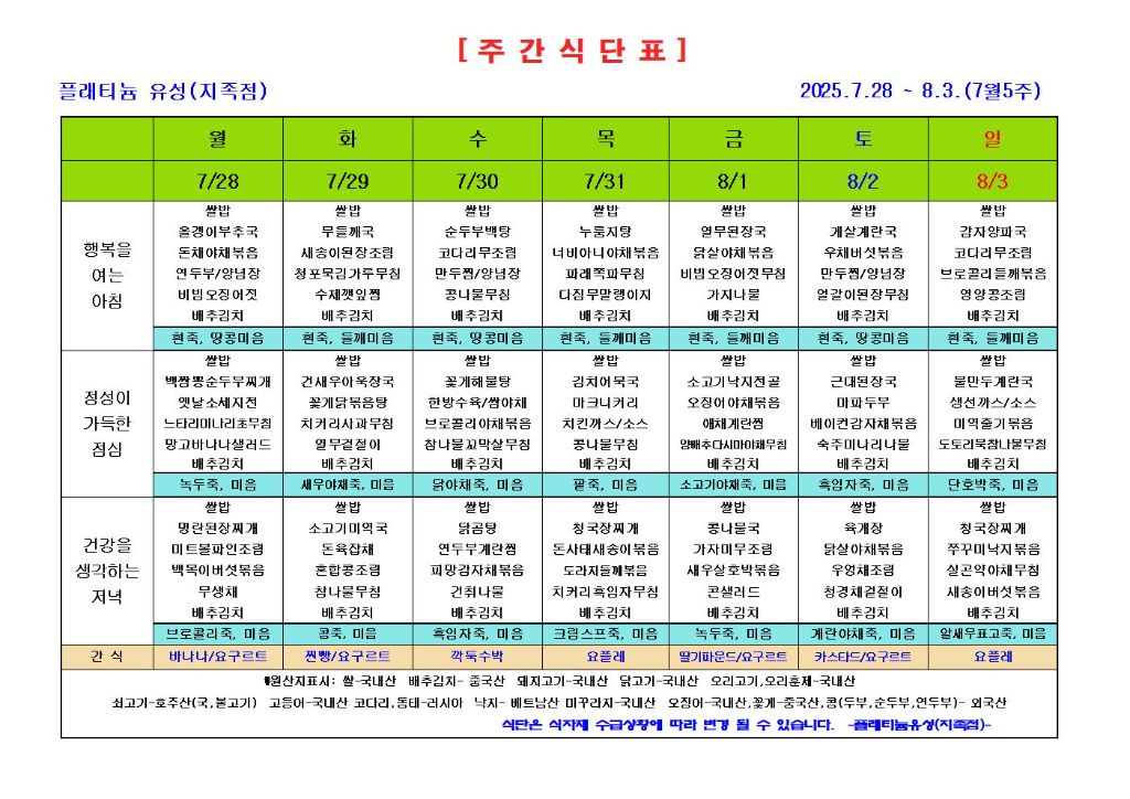 ♡ 2025년 7월 5주 식단안내(7월28일~8월3일) 관리자 2025-07-27 08:52 ♡ 2025년 7월 5주 식단안내(7월28일~8월3일) 다음글 ♡ 2025년 8월 1주 식단안내(8월4일~8월10일) 이전글 ♡ 2025년 7월 4주 식단안내(7월21일~7월27일) 목록