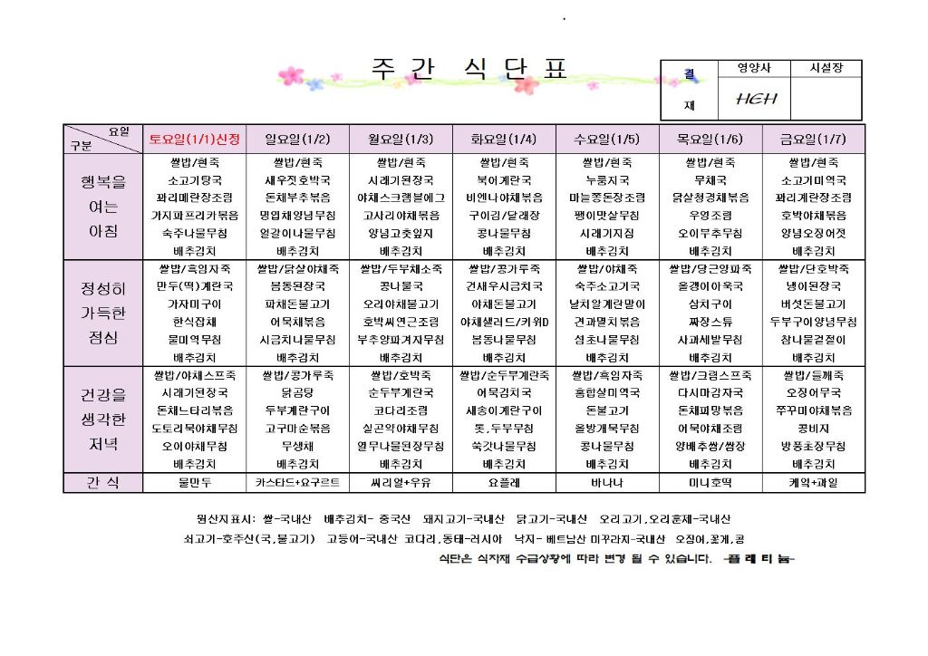 ♡ 2022년 1월 1주 식단안내(1월1일~1월7일) 최고관리자 2021-12-29 12:25 다음글 ♡ 2022년 1월 2주 식단안내(1월8일~1월14일) 이전글 ♡ 2023년 4월 가정통신문 목록