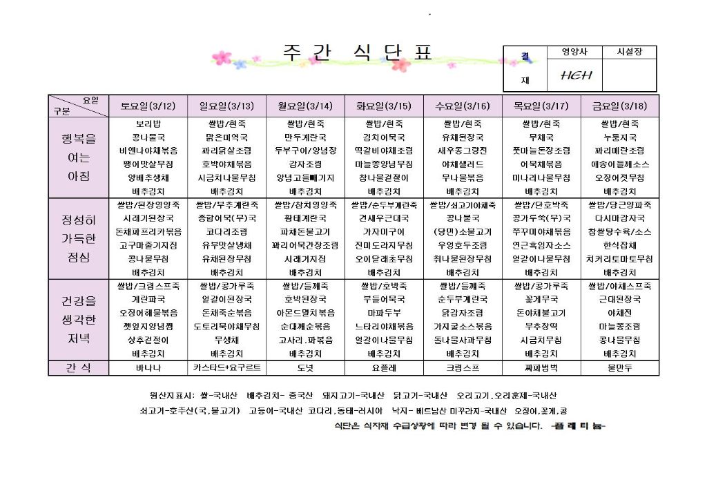 ♡ 2022년 3월 3주 식단안내(3월12일~3월18일) 최고관리자 2022-03-11 15:41 다음글 ♡ 2022년 3월 4주 식단안내(3월19일~3월25일) 이전글 ♡ 2022년 3월 2주 식단안내(3월5일~3월11일) 목록