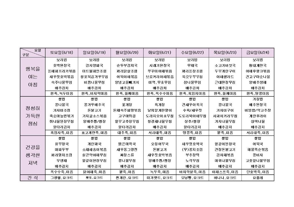 ♡ 2022년 6월 4주 식단안내(6월18일~6월24일) 최고관리자 2022-06-17 14:59 다음글 ♡ 2022년 6월 5주 식단안내(6월25일~7월1일) 이전글 ♡ 2022년 6월 2주 식단안내(6월11일~6월17일) 목록