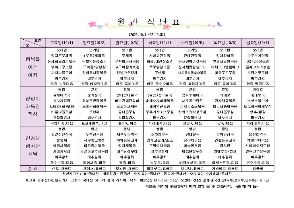 ♡ 2022년 10월 1주 식단안내(10월1일~10월7일) 최고관리자 2022-09-30 16:16 다음글 ♡ 2022년 10월 2주 식단안내(10월8일~10월14일) 이전글 ♡ 2022년 9월 5주 식단안내(9월24일~9월30일) 목록