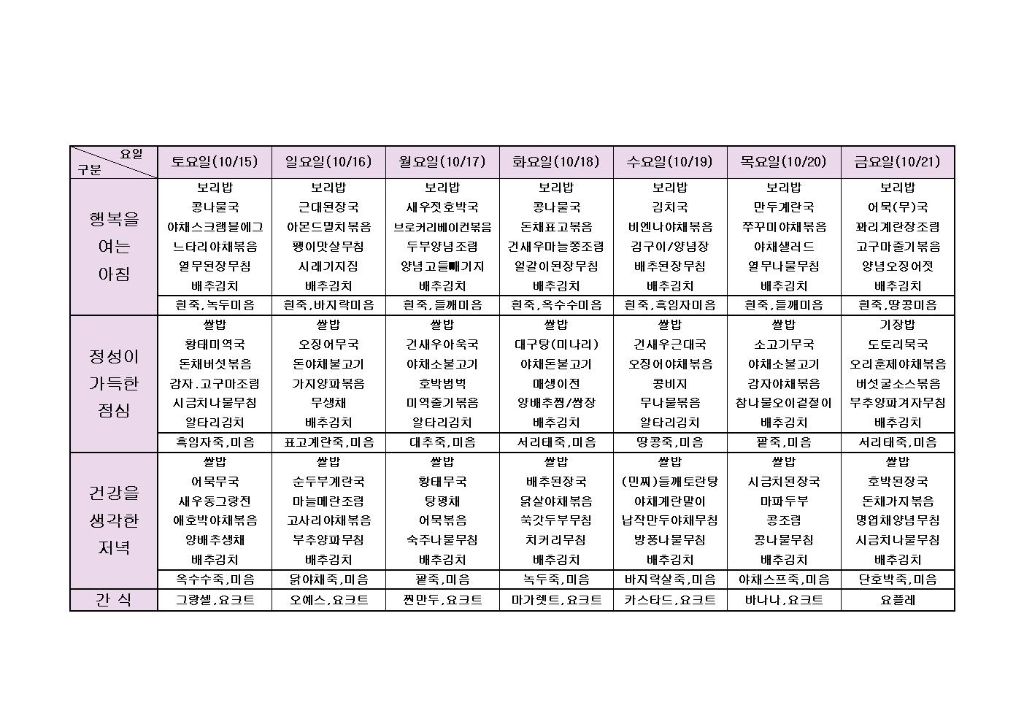 ♡ 2022년 10월 3주 식단안내(10월15일~10월21일) 최고관리자 2022-10-14 09:59 다음글 ♡ 2022년 10월 4주 식단안내(10월22일~10월28일) 이전글 ♡ 2022년 10월 2주 식단안내(10월8일~10월14일) 목록