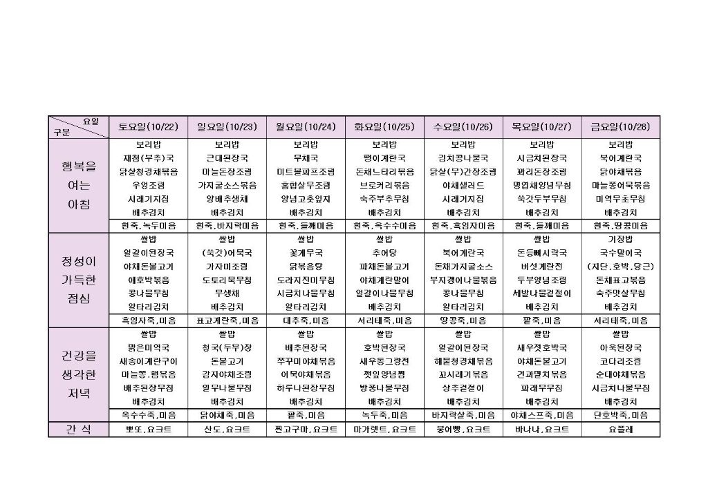 ♡ 2022년 10월 4주 식단안내(10월22일~10월28일) 최고관리자 2022-10-21 16:20 다음글 ♡ 2022년 10월 5주 식단안내(10월29일~10월31일) 이전글 ♡ 2022년 10월 3주 식단안내(10월15일~10월21일) 목록