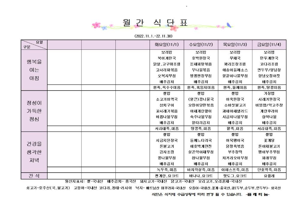 ♡ 2022년 11월 1주 식단안내(11월1일~11월4일) 최고관리자 2022-10-31 09:12 다음글 ♡ 2022년 11월 2주 식단안내(11월5일~11월11일) 이전글 ♡ 2022년 10월 5주 식단안내(10월29일~10월31일) 목록