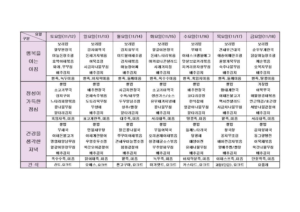 ♡ 2022년 11월 3주 식단안내(11월12일~11월18일) 최고관리자 2022-11-11 16:23 다음글 ♡ 2022년 11월 4주 식단안내(11월19일~11월25일) 이전글 ♡ 2022년 11월 2주 식단안내(11월5일~11월11일) 목록