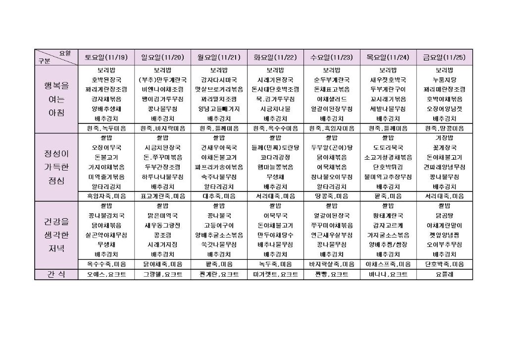♡ 2022년 11월 4주 식단안내(11월19일~11월25일) 최고관리자 2022-11-18 16:24 다음글 ♡ 2022년 11월 5주 식단안내(11월26일~11월30일) 이전글 ♡ 2022년 11월 3주 식단안내(11월12일~11월18일) 목록