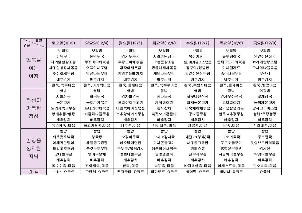 ♡ 2022년 12월 2주 식단안내(12월3일~12월9일) 최고관리자 2022-12-02 16:27 다음글 ♡ 2022년 12월 3주 식단안내(12월10일~12월16일) 이전글 ♡ 2022년 12월 1주 식단안내(12월1일~12월2일) 목록