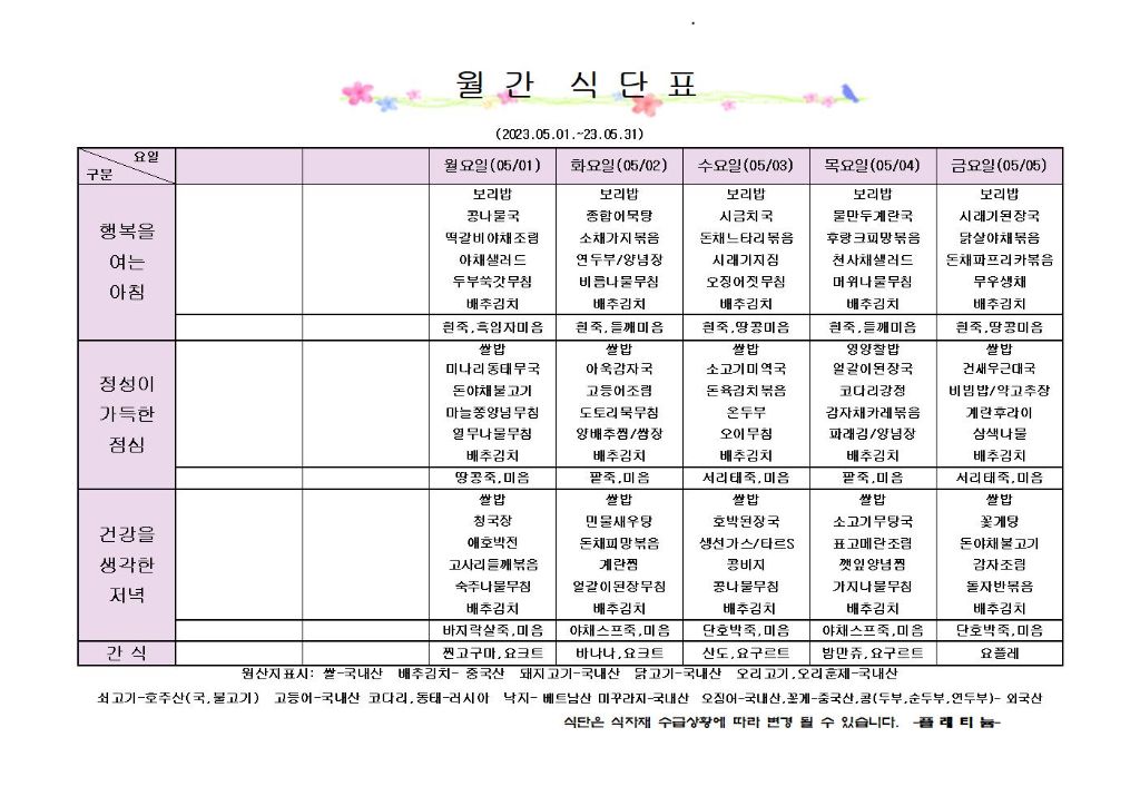 ♡ 2023년 5월 1주 식단안내(5월1일~5월5일) 최고관리자 2023-05-01 16:52 다음글 ♡ 2023년 5월 2주 식단안내(5월6일~5월12일) 이전글 ♡ 2023년 4월 5주 식단안내(4월29일~4월30일) 목록