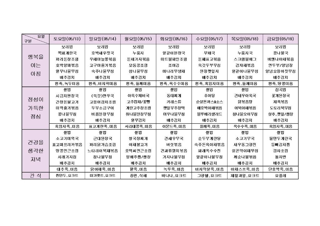 ♡ 2023년 5월 3주 식단안내(5월13일~5월19일) 최고관리자 2023-05-12 10:24 다음글 ♡ 2023년 5월 4주 식단안내(5월20일~5월26일) 이전글 ♡ 2023년 5월 2주 식단안내(5월6일~5월12일) 목록