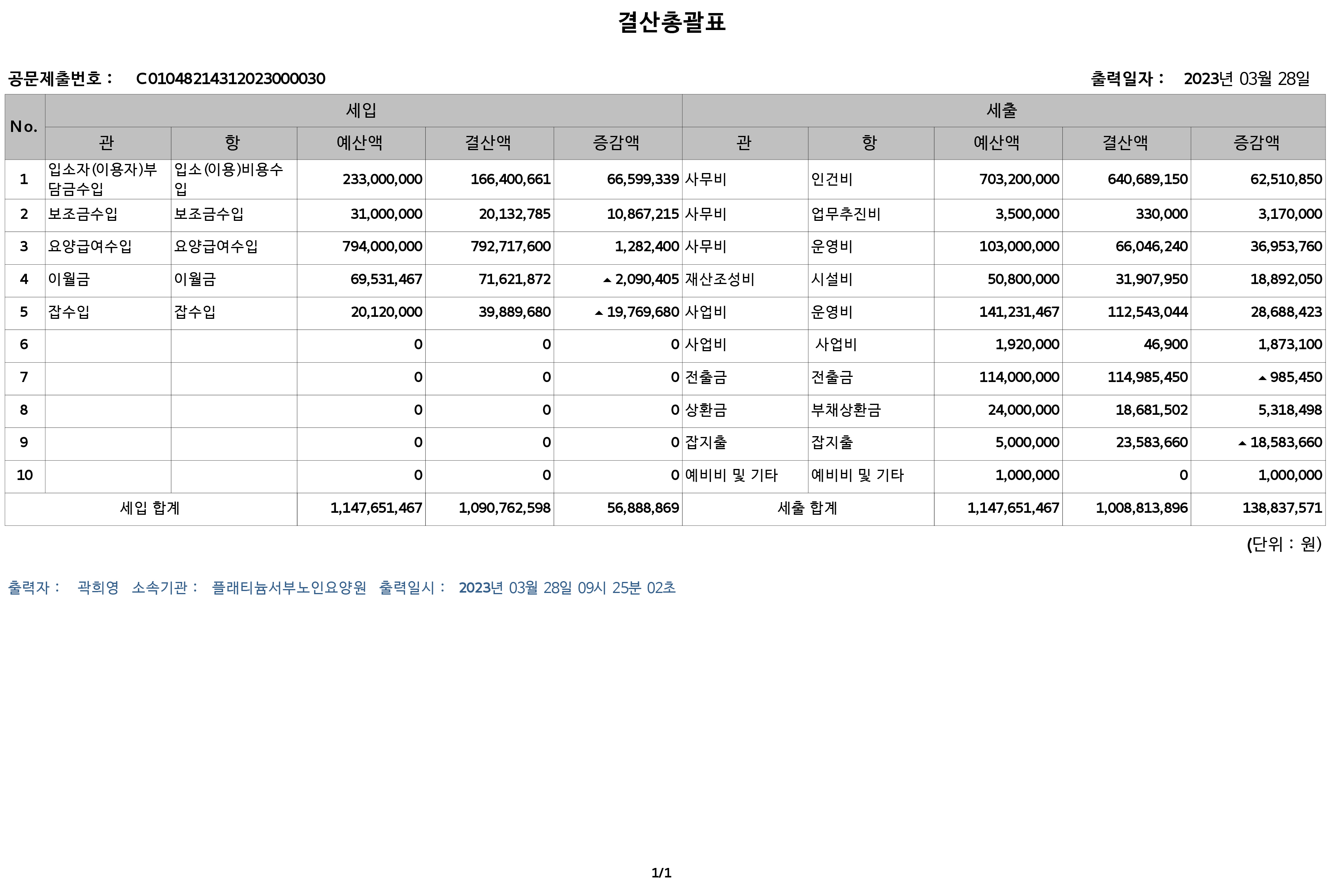 플래티늄 유성 22년 세입세출결산공고 최고관리자 2023-03-24 14:20 사회복지법인 및 사회복지시설 재무회계규칙 제 19조, 제20조에 의거 2022년 세입세출 결산을 홈페이지에 공고합니다. 첨부파일 2022결산총괄표23년3월28일.jpg 다음글 플래티늄 유성 23년 예산공고 이전글 플래티늄 유성 22년 예산공고 목록