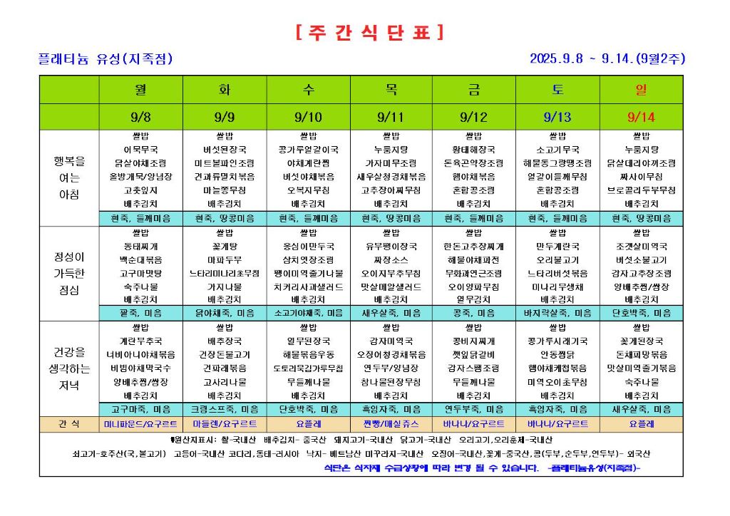 ♡ 2025년 9월 2주 식단안내(9월8일~9월14일) 관리자 2025-09-03 11:00 ♡ 2025년 9월 2주 식단안내(9월8일~9월14일) 다음글 ♡ 2025년 9월 3주 식단안내(9월15일~9월21일) 이전글 ♡ 2025년 9월 프로그램 안내 목록