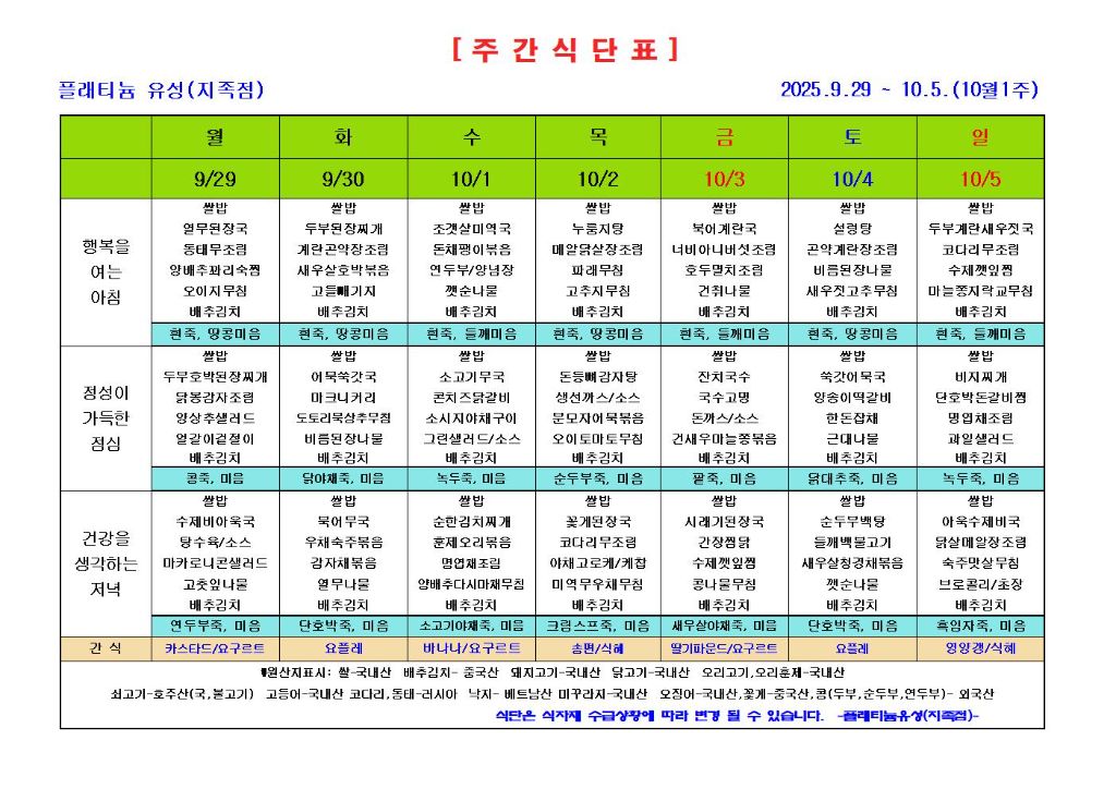 ♡ 2025년 10월 1주 식단안내(9월29일~10월5일) 관리자 2025-09-24 08:48 ♡ 2025년 10월 1주 식단안내(9월29일~10월5일) 다음글 ♡ 2025년 9월 가정통신문 이전글 ♡ 2025년 3분기 운영위원회 개최안내 목록