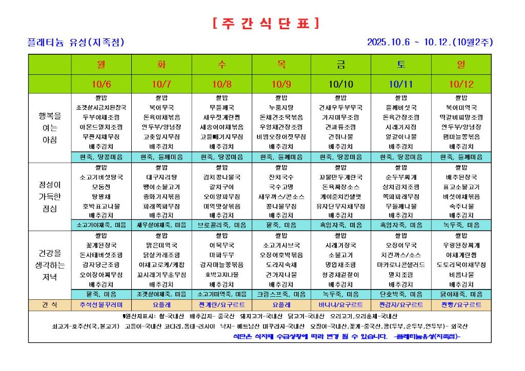 ♡ 2025년 10월 2주 식단안내(10월6일~10월12일) 관리자 2025-10-01 08:58 ♡ 2025년 10월 2주 식단안내(10월6일~10월12일) 다음글 ♡ 2025년 10월 3주 식단안내(10월13일~10월19일) 이전글 ♡ 2025년 추석 명절 인사 목록