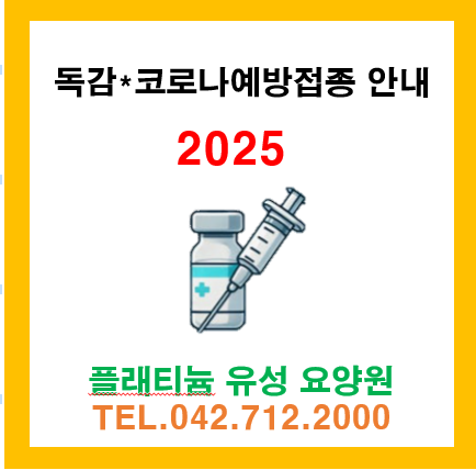 ♡ 2025년 입소어르신 독감*코로나 예방 접종 안내 관리자 2025-10-15 09:57 안녕하세요. 플래티늄 유성 요양원입니다.2025년 어르신 독감* 코로나 예방접종을 아래와 같이실시하고자 하오니 궁금한 사항은 원으로 전화 부탁드립니다.미리 사전에 전화로 어르신의 접종 동의 여부를 파악하였으며,이에 보호자님의 동의 여부에 맞게 진행하도록 하겠습니다.일교차가 심한날씨, 보호자님 또한 건강 유의하시길 바랍니다.감사합니다.-아 래- ㅇ 어르신 독감*코로나 동시 예방접종ㅇ 일 시: 2025년 11월 6일 (목)ㅇ 장 소: 플래티늄 유성 요양원 내ㅇ 대 상: 입소 어르신 (보호자 동의하에 진행)ㅇ 접종병원: 협력병원 대전재활병원* 코로나 접종백신: LP 8.1백신(화이자, 모더나)* 협력병원의 사정으로 기간이 변경될 수 있는 점 이해해주세요.* 독감*코로나 예방접종은 협력병원과 연계하여 방문접종 실시 다음글 ♡ 2025년 10월 4주 식단안내(10월20일~10월26일) 이전글 ♡ 2025년 입소어르신 건강검진 안내 목록