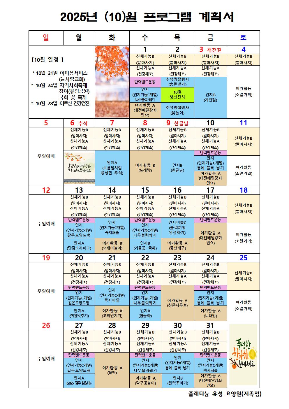 ♡ 2025년 10월 프로그램 안내 관리자 2025-11-03 13:32 ♡ 2025년 10월 프로그램 안내 다음글 ♡ 2025년 11월 2주 식단안내(11월10일~11월16일) 이전글 ♡ 2025년 10월 가정통신문 목록